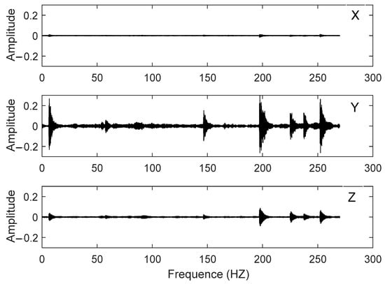 HHT and VMD–HHT methods can separate each event in the time dimension and reflect the intensity of each event (Figure 10). It can be seen that the frequency range is about 1 Hz, and the intensity of three events is gradually strengthening, corresponding to amplitudes at 10 mm, 30 mm, and 50 mm. Comparing Figure 10 and Figure 11 show that the HHT spectrum is noisier than the VMD–HHT spectrum. We can also observe that the intensity displayed in the HHT spectrum is smaller than the VMD–HHT spectrum, and the latter is more clearly detected. However, the frequency values at the beginning and end of each signal also reach higher values, especially the signal with amplitude at 50 mm. It is probably caused by endpoint effect. Overall, VMD–HHT can extract the characteristics of time, frequency, and energy more reliably than HHT.