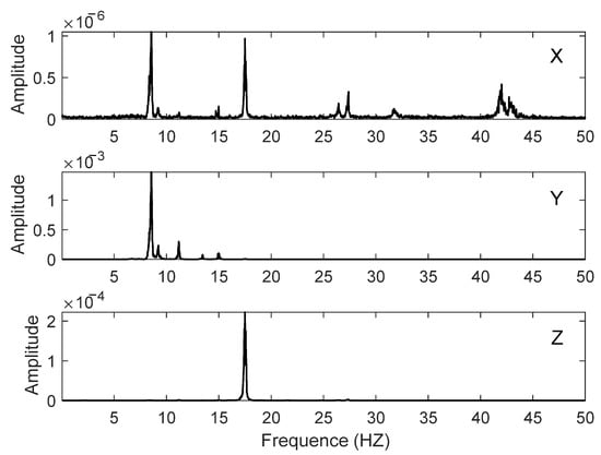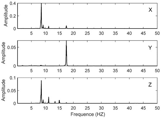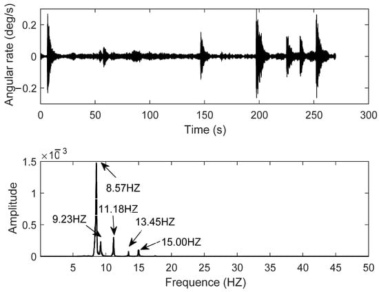 Figure 22 (bottom) shows the PSD in correspondence to angular rate output in the Y-axis of the gyroscope, which included five peaks whose corresponding frequencies were 8.57 Hz, 9.23 Hz, 11.18 Hz, 13.45 Hz, and 15.00 Hz, respectively. The main peak frequency was 8.57 Hz. Referring to Figure 2, the frequencies extracted from the X-axis of the accelerometer were 8.55 Hz, 9.23 Hz, 11.18 Hz, and 17.50 Hz independently, while the main peak frequency was 8.55 Hz. By comparing two sets of data, it is evident that collision frequencies extracted from the X-axis of accelerometer and Y-axis of gyroscope were very similar. To be more specific, the distribution was consistent, but the amplitude corresponding to each frequency had a high coherence. To summarize, the frequencies of dynamic responses could be extracted from gyroscope data of MIMU.