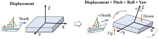 To obtain torsion angle responses caused by ship collisions, the gyroscope data of MIMU were analyzed by Mahony complementary filter. Figure 20 shows the three-axis angular rate data correctly without bias, suggesting that the Y-axis of the gyroscope was influenced by the collision most. From the above analyses, it can be concluded that X-axis was the main direction of displacement response. When the ship stroked the north of the platform (X-axis), displacement responses would be caused in the same direction, while the platform was found out to incline towards Y-axis. A visual representation of the process is given in Figure 21.