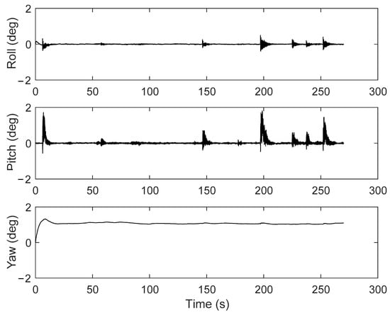 To obtain the torsion angle response data of the platform, Mahony Complementary Filtering was used to solve the torsion angle change of platforms by integrating the information of accelerometer and gyroscope. As can be seen from the torsion angle calculation results of Figure 26, the pitch angle (Y-axis rotation) changed significantly with a maximum angle of 1.2°, followed by the roll angle (X-axis rotation) with a maximum angle of 0.15°. The heading angle (Z-axis rotation) did not change significantly with the impact event, but it deviated about 1.1° from the X direction (north direction). Therefore, Conjecture 2 could be verified. In other words, the misalignment between the installation axes of MIMU and the geographical coordinate system leads to the displacement component of the Y-axis and the rotation of the Z-axis. All the above analyses show that ship collisions will cause displacement responses and make the platform tilt or even twist. In addition, the relationship between the accelerometer and the gyroscope is also revealed: The impact on the X direction caused the Y-axis to rotate, that is, the pitch angle changes. The impact direction had a component on the Y-axis to cause the X-axis rotation, which is, the roll angle changes. The Z-axis rotation was caused by a small-angle oblique impact, which was the change of heading angle.