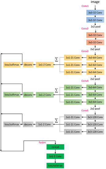 In [35], Liu et al. proposed a small network for edge detection. Considering the similar motivation of exploiting the multiscale information, we designed our segmentation network based on its RCF model. To achieve an even higher forward speed so that the whole system is real-time, we further shrank the RCF model by reducing the channel numbers, as well as removing some redundant skip connections, as we show in Figure 3. In this work, we term this reduced RCF as , whose structure is shown in Figure 3. We can see that the backbone of the network is the shrunken version of the VGG-16 network [36,37] with three extra branches and their corresponding intermedia loss layers.