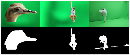 In recent years, much effort has been made to handle the natural matting problem, in which the foreground and background are not predefined. Though accused of being ill-posed, deep-learning-based methods [8,9,10,28] still illustrate high accuracy in this task. Recent approaches have also focused on matting without any external input [29,30,31,32] and matting with a known natural background [33,34]. It seems we can easily pick one of the above “off-the-self” matting networks for our green screen matting. However, those networks are relatively large to extract more abstract semantic information, which is important for robust natural matting. On the contrary, in green screen matting, some low-level features are already informative enough, and thus, the above networks are unnecessarily complex and slow in our task.