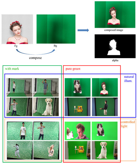 The illustration of the proposed new green screen dataset (portraits were permitted in October 2018). Top: the illustration of foreground and background fusion; bottom: the image samples of Green-2018 with 2 major attributes, which are textured or pure green screen and natural or controlled lighting condition, respectively. Note that the outside region of the green screen is treated as foreground in the dataset.
