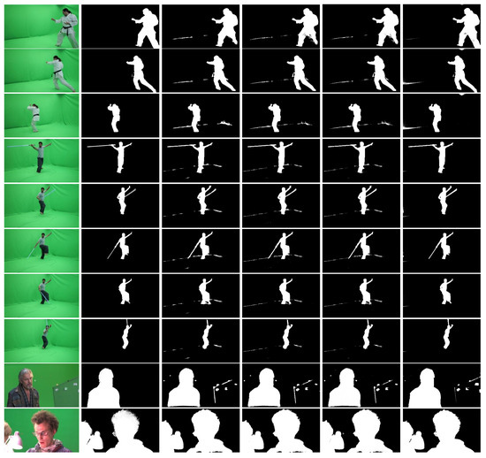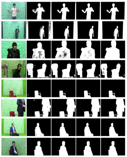 However, the situation changed dramatically when the same experiment was conducted on some real-life images, rather than the “synthetic” images employed in the Green-2018 dataset. We captured eight video sequences with a real human shown in front of the same background setting as in Green-2018 (see Figure 7). As can be seen, the “trimap” obtained using the model became imperfect and sometimes even incorrect. In this scenario, the deep-learning-based methods deteriorated rapidly, and the proposed method still maintained a relatively high matting accuracy. Our method illustrated much higher matting robustness against the “state-of-the-art” matting approaches.