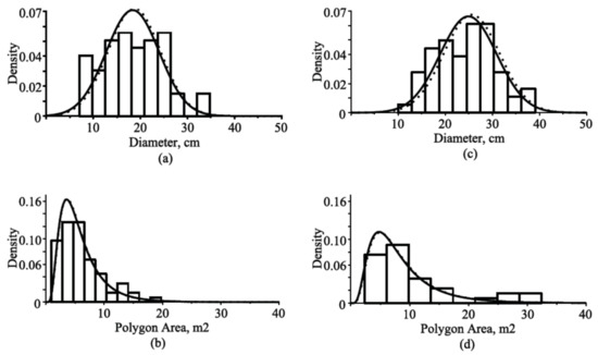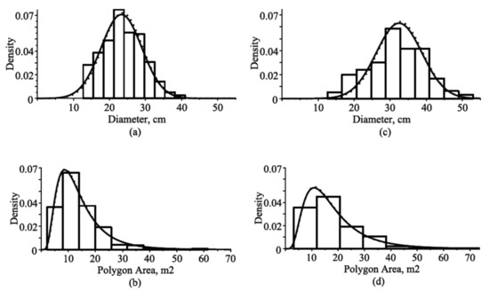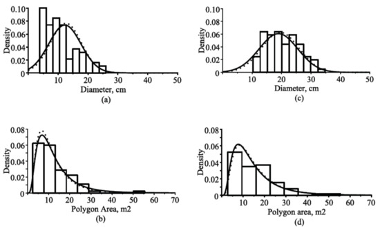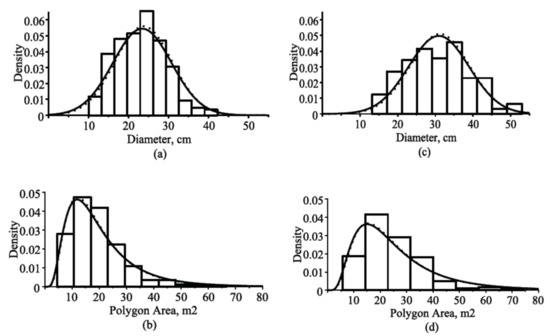 Figure 2, Figure 3, Figure 4 and Figure 5 show that univariate conditional probability density functions defined by inserting additional explanatory variable polygon areas or diameters undergo indistinguishable changes in comparison with corresponding univariate marginal densities. The similarity of the marginal and conditional distributions suggests that the additional explanatory variable (polygon area or diameter) has a relatively small effect on the values of the response variable (diameter or polygon area). Moreover, the figures superpose frequency distribution and estimated normal or lognormal probability distributions that correspond to the probability density function of the solutions of SDE (2). Frequency distributions are not exactly in agreement with the normal or lognormal distribution shapes due to the variation in tree age or probably did not arise from our presented form. The tree diameter histograms shown in Figure 2, Figure 3, Figure 4 and Figure 5 confirm the assumption that the tree-diameter distribution in a particular forest stand has an approximately symmetrical shape. The lack of symmetry in Figure 4 for Norway spruce trees occurs probably due to the planned thinning in the stand, as lightening works are usually carried out in stands of this age. The symmetry and standard deviation of the diameter distribution increase with age. In contrast, the polygon area histograms reveal asymmetry of the distribution, and the long tail extends to the right. Histograms of the polygon area show a number of unusual observed values. This scenario may be the result of a directional felling or soil properties. Lastly, the newly derived bivariate probability density function was a good match for our validation data.