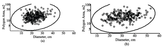 The results of statistical measures of polygon area predictions, calculated using tree positions from the validation dataset, the fixed-effect parameters from Table 2, and random effects calibrated by Equation (27), are presented in Table 5, which clarifies the importance of the diameter employed in the modeling process. The prediction performance of both models defined by Equations (10) and (22) showed that both models were highly capable of identifying the mean value of the polygon area in a plot. On the other hand, only small improvement in the statistical measures was found (up to 3% in the coefficient of determination) when we used diameter as an additional explanatory variable in the conditional model defined by Equation (22).
