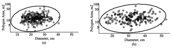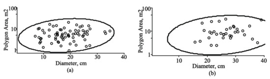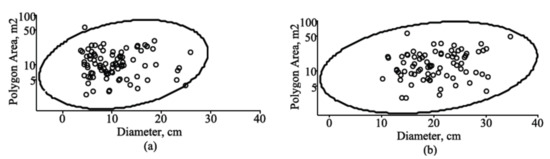 Tolerance region for mean vector with the observed sample from the validation dataset of silver birch tree species in two measurement cycles: (a) tolerance region of diameter and polygon area for first cycle (mean age, 44.7 years; mean diameter, 18.60 cm; and mean polygon area, 6.11 m2); (b) tolerance region of diameter and polygon area for fourth cycle (mean age, 81.0 years; mean diameter, 25.94 cm; and mean polygon area, 10.44 m2); tolerance region, solid line; observed dataset, circles.
