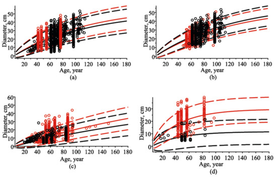 Dynamic of mean, 5%, and 95% percentiles of diameter with observed datasets for two randomly selected stands from the validation dataset: (a) all tree species; (b) Scots pine tree species; (c) Norway spruce tree species; (d) silver birch tree species; observed dataset of diameters, circles; mean trend, solid lines; percentiles, dashed lines; first stand, black; second stand, red.