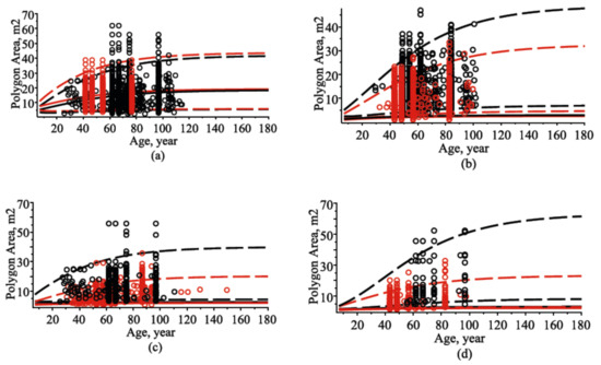 Dynamic of mean, 5%, and 95% percentiles of polygon area with observed datasets for two randomly selected stands from the validation dataset: (a) all tree species; (b) Scots pine tree species; (c) Norway spruce tree species; (d) silver birch tree species; observed dataset, circles; mean trend, solid lines; percentiles, dashed lines; first stand, black; second stand, red.