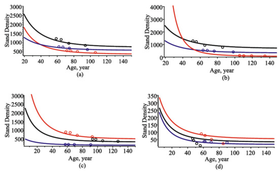 Dynamic of mean stand density with observed datasets for three randomly selected stands from the validation dataset: (a) all tree species; (b) Scots pine tree species; (c) Norway spruce tree species; (d) silver birch tree species; observed dataset, circles; mean trend, solid lines; first stand, black; second stand, red; third stand, blue.