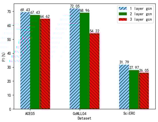 In this section, we analyze the effect of different layers of GCN on the FC-GCN model. Specifically, we test the GCN layer numbers of 1, 2, and 3 on the three datasets. Additionally, the experimental results are shown in Figure 3. Firstly, it can be seen from the figure that no matter which dataset is used, the result of one layer of GCN is always higher than that of multi-layer GCN. Specifically, it can be clearly seen from the figure that the gap between one layer of GCN and two layers of GCN is the largest on the SciERC dataset, with a difference of 3.82% in F1 value. However, on the ACE05 and CoNLL04 datasets, the largest difference in F1 values is the two layers of GCN and the three layers of GCN, with a difference of 2.81%, 14.74% in F1 value, respectively. Moreover, compared with the results of the ACE05 and CoNLL04 datasets, the difference between the results on the SciERC dataset is not very large. This may be because the sources of these three datasets are different. Additionally, the information contained in them is also different. Thus, the hidden features needed to analyze the information are also different.