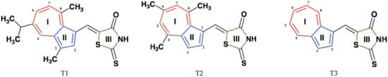 The structures of investigated compounds are shown in Figure 1. In order to depict the structural differences, the common parts of their structures were similarly coloured in: red—the seven-membered azulene ring (I), blue—the five-membered azulene ring (II), and green—the cycle of the thiazolidine (III).