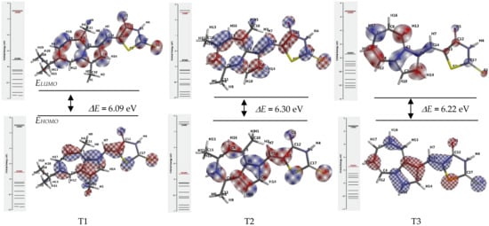 From Figure 2, a quite similar distribution of the frontier molecular orbitals can be observed for the three compounds. The frontier orbitals gap (ΔE) which characterizes the chemical reactivity of each molecule, are different for these compounds. The higher value of ΔE gap is found for T2, and it reflects its higher kinetic stability [45,46] expected due to symmetry reasons.