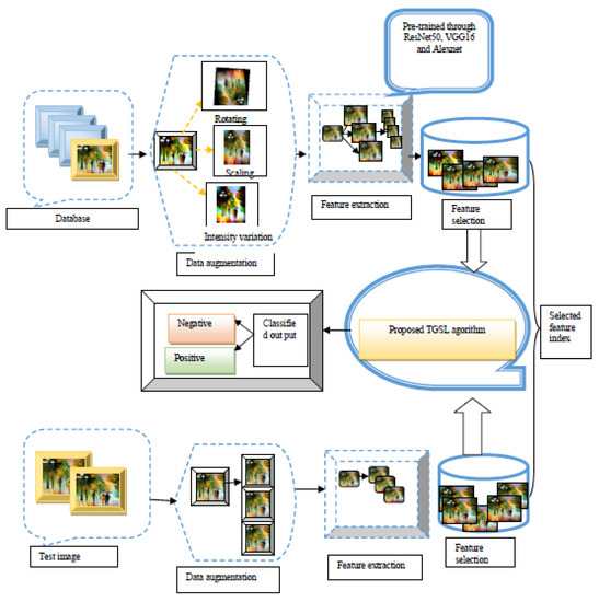 The prime intention of the Visual sentimental analysis is to analyze the expressions of a person concerning the visualized image, which invokes the emotions such as disgust, excitation and fear. The diagrammatic representation of the proposed framework is shown in Figure 2. The entire process of visual sentiment analysis is implemented in the four-step process, such as Data augmentation, feature extraction, feature selection and image classification. First, the clipped images are generated in the data augmentation module using the processes, such as intensity variations, rotation and Scaling of the input images, subject to the feature extraction using the pre-trained models, such asVGG16, Alexnet and ResNet50. The extracted features using the pre-trained model are subjected to the feature selection using the proposed TGSL algorithm that selects the most relevant features to reduce computational complexity. Finally, the visual sentiment classification is carried outusing the SVM classifier.