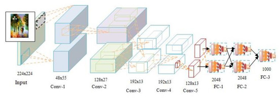Figure 3 depicts the architectural model of the Alexnet. The Alexnet utilizes the Rectifier linear units (RLUs) as an alternative to the tanh function, reducing computational time.