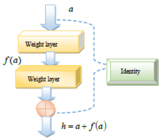 ResNet is the widely utilized training model among the deep network, which acquires the first position in the ImageNet Large Scale Visual Recognition Challenge (ILSVRC) and Common Objects in Context (COCO). The ResNet is considered one of the innovative solutions for the vanishing gradient issues that result in performance saturation. ResNet has several stacked residual units and developed many different networks with deep layers: 18, 34, 50, 101, 152 and 1202. A deeper CNN stacked with more layers has the vanishing gradient problem, and this architecture overcomes it by the residual learning module. The single residual block of the ResNet50 is demonstrated in Figure 4. The overall architecture of ResNet50 is illustrated in Figure 5. ResNet-50 uses the bottleneck architecture; it has six units, the convolutional layer followed by four stacked residual blocks of 3 × 3 convolutional layers and a fully connected layer; this can quickly train the network. Finally, the 100th fully connected layer features are gathered for establishing the feature vector, where the dimension is for an input image.