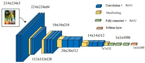 VGG is one of the advanced frameworks of the Convolutional Neural network, which focuses on enhancing the precision of the network. VGG 16 architecture comprises 13 convolutional layers and three fully connected layers. The input image is fixed at , which is fed to the stack of the convolutional layers, and a small filter of size is utilized in the VGG16 architecture as an alternative to large filters. The final fully connected layer features are derived as the feature whose dimension is , and the very last layer is the SoftMax layer. The architecture of VGG16 is depicted in Figure 6.