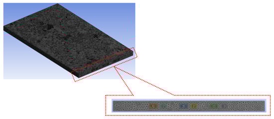 The governing equations are solved using the finite volume method and second order approach. The tetrahedron mesh elements are considered for the computational geometry of the heat exchanger and fluid domains. The inflation layers are provided on the fluid domains to consider the effect of boundary layers at the walls of the heat exchanger. The mesh independency test is carried out by generating five different mesh element numbers on the computational geometry. The results of performance index are evaluated for different mesh element numbers by considering the flow of water as hot and cold fluids. The inlet temperature and mass flow rate on the hot side are 90 °C and 20 kg/h, and those on the cold side are 20 °C and 20 kg/h. The mesh independency results for five different mesh elements are presented in Table 1. The temperature and pressure drop results for hot and cold fluids are significantly varying when the mesh element numbers are ranging from 157,649 to 732,993. However, beyond the mesh element number of 732,993, the simulated results of outlet temperatures and pressure drops of hot and cold fluids vary within 1% [49]. Therefore, the computational geometry with a mesh element number of 732,993 is considered for the further numerical investigations. The mesh configuration of computational geometry with selected final mesh elements is depicted in Figure 2. The SIMPLE scheme with velocity-pressure coupling and the convergence criteria of 10−8 are considered for solving the governing equations.