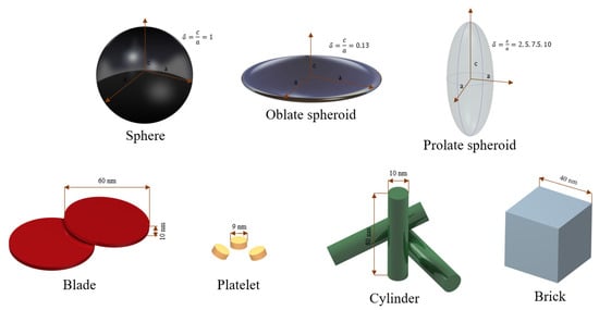 The aspect ratio of spheroids is expressed as Equation (21). The parameters a and c are denoted as lengths of spheroid semi-axes, which could be seen in Figure 3. For OS- and PS-shaped nanoparticles, these parameters are presented by Equations (22) and (23), respectively [53].