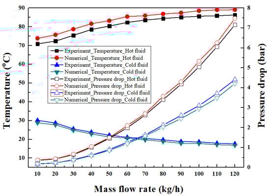 Comparison experimental and numerical results of temperature and pressure drop for hot and cold fluids.
