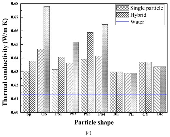 The nanoparticle shape affects the thermal conductivity and viscosity of single-particle nanofluids. The thermal conductivity of single-particle nanofluids with Sp-, OS-, PS1-, PS2-, PS3- and PS4-shaped nanoparticles are calculated using the model proposed by Hamilton–Crosser, as presented by Equation (16). The model proposed by Timofeeva et al. [4], as presented by Equation (17), is used to calculate the thermal conductivity of single-particle nanofluids with BL-, PL-, CY-, and BR-shaped nanoparticles [53].