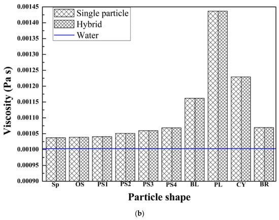 The viscosity of single-particle nanofluids with Sp-, OS-, PS1-, PS2-, PS3- and PS4-shaped nanoparticles is evaluated using Equation (18). This equation is proposed by Muller et al., based on the mathematical model presented by Maron and Pierce. For calculating the viscosity of single-particle nanofluids with BL-, PL-, CY-, and BR-shaped nanoparticles, Timofeeva et al.’s [4] model, as presented by Equation (19), is used [53].