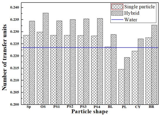 The comparison of NTU for single-particle and hybrid nanofluids with different nanoparticle shapes is shown in Figure 6. The NTU of single-particle and hybrid nanofluids are improved for nanoparticle shapes of Sp, OS, PS1, PS2, PS3, PS4, BL and BR compared to water because of improvement in the thermophysical properties of single-particle and hybrid nanofluids. In the case of PL-shaped nanoparticles, the NTU values are lower for both single-particle and hybrid nanofluids compared to water, due to a higher velocity of PL-shaped nanoparticles. The OS- and PL-shaped nanoparticles present the lowest and highest velocities, respectively, which results correspondingly into the lower and higher values of heat transfer coefficients. The lower velocity of OS-shaped nanoparticles results in a lower heat capacity, which dominates the lower heat transfer coefficients. Hence, as per Equation (43), it results in the highest NTU value. The higher velocity of PL-shaped nanoparticles results in a higher heat capacity and higher heat transfer coefficient; therefore, based on Equation (43), the combined effect of a higher heat transfer coefficient and a higher heat capacity presents a lower NTU for PL-shaped nanoparticles. The higher heat capacity dominates the higher heat transfer coefficient for PL-shaped nanoparticles. In the case of CY-shaped nanoparticles, the hybrid nanofluid shows superior NTU values and single-particle nanofluid shows poorer NTU values than water. In addition, for the same nanoparticle shape, the NTU of the Al2O3/Cu nanofluid is superior to the NTU of the Al2O3 nanofluid due to the addition of high thermal conductivity Cu nanoparticles to the Al2O3 nanofluid, which results in the thermal conductivity improvement of the Al2O3/Cu nanofluid. Bahiraei et al. have shown similar results of OS- and PL-shaped nanoparticles with the highest and lowest NTU, respectively, for single-particle nanofluids [19]. The NTU values of the Al2O3 and Al2O3/Cu nanofluids with OS-shaped nanoparticles are higher by 2.86% and 6.38%, respectively, compared to the NTU of water. The Al2O3 and Al2O3/Cu nanofluids with PL-shaped nanoparticles present the NTU values as lower by 3.99% and 1.82%, respectively, compared to the NTU of water.