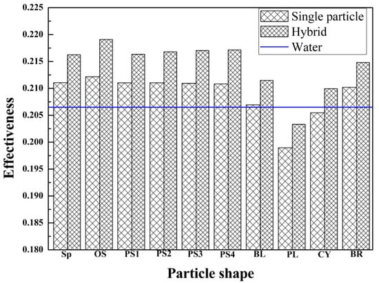 The effectiveness of single-particle and hybrid nanofluids with different nanoparticle shapes are compared in Figure 7. For the same nanoparticle shapes, the effectiveness of the Al2O3/Cu nanofluid are better than the Al2O3 nanofluid because of an increase in the thermal conductivity of the hybrid nanofluid by the dispersion of high thermal conductivity nanoparticles. The behavior of effectiveness is same as of the NTU for single-particle and hybrid nanofluids with all nanoparticle shapes. For the single-particle nanofluids, OS-shaped nanoparticles present the highest effectiveness, followed by Sp, PS1 = PS2, PS3, PS4, BR, BL, CY and PL in decreasing order of effectiveness, in which the effectiveness of CY- and PL-shaped nanoparticles are lower than water. In the case of the hybrid nanofluid, the decreasing order of effectiveness is OS, PS4, PS3, PS2, PS1, Sp, BR, BL, CY and PL, respectively, in which the effectiveness value of PL-shaped nanoparticles is lower than water. Shahsavar et al. have also presented a lower effectiveness for alumina nanofluids with PL-shaped nanoparticles [26]. The velocity of different-shaped nanoparticles is in the inverse relation with the temperature gradient. Therefore, the lower velocity of OS-shaped nanoparticles raises the temperature variation of nanofluids, which results in higher effectiveness. The effectiveness values of Al2O3 and Al2O3/Cu nanofluids with OS-shaped nanoparticles are higher by 2.75% and 6.10%, respectively, and those with PL-shaped nanoparticles are lower by 3.65% and 1.54%, respectively, compared to the effectiveness of water.
