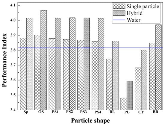 The performance index presents the combined effect of heat transfer and pressure drop characteristics. The comparison of the performance index of single-particle and hybrid nanofluids with different particle shapes is presented in Figure 8. The particle shape with the superior combination of thermal conductivity and viscosity shows the higher value of the performance index. Therefore, single-particle and hybrid nanofluids with OS-shaped nanoparticles show the highest values of the performance index among all nanoparticle shapes and water. The performance index values of single-particle and hybrid nanofluids with PL-shaped nanoparticles are lowest among all nanoparticle shapes, as well as water, due to poor thermal conductivity and viscosity. Despite the lower heat transfer rate in OS-shaped nanoparticles, the lowest pressure drop results in the highest performance index. Whereas, the higher pressure drop for PL-shaped nanoparticles results in the lowest performance index. Vo et al. have also illustrated that the pressure drop of PL-shaped nanoparticles is superior to other nanoparticle shapes, which increases as the volume fraction increases [20]. The OS- and PL-shaped nanoparticles show the maximum and minimum performance indexes for the alumina nanofluid, as proven by Bahiraei et al. and Arani et al. [19,53]. The single-particle and hybrid nanofluids with CY-shaped nanoparticles and the single-particle nanofluids with BL-shaped nanoparticles show a lower performance index than water despite better thermal conductivity because of higher viscosity and density. Apart from these combinations, other nanoparticle shapes present better performance index than water, in which hybrid nanofluids show a superior performance index than the single-particle nanofluid. The Al2O3 and Al2O3/Cu nanofluids with OS-shaped nanoparticles present the performance index as higher by 2.24% and 6.58%, respectively, and those with PL-shaped nanoparticles present the performance index as lower by 8.78% and 5.80%, respectively, than water. The single-particle and hybrid nanofluids with other nanoparticle shapes show the performance index values in a range between the highest and lowest values.