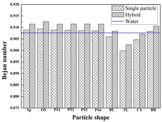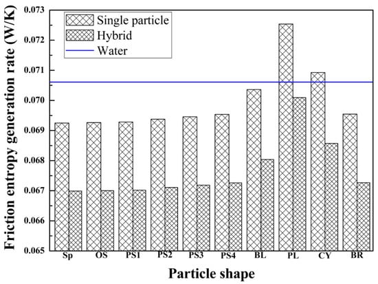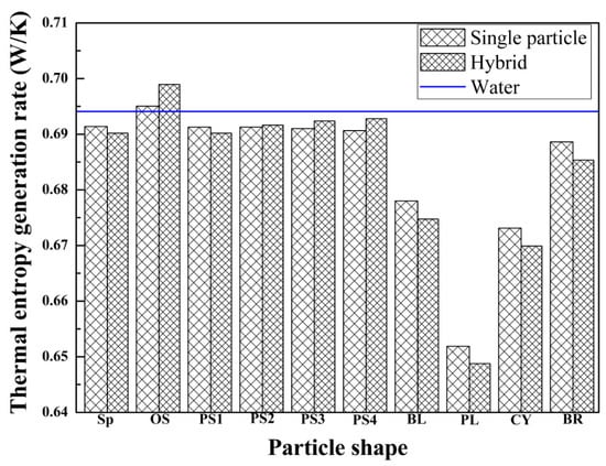 The thermal entropy generation rate for single-particle and hybrid nanofluids with different nanoparticle shapes is depicted in Figure 9. The thermal entropy generation is due to heat transfer, which depends on the temperature gradient. The thermal entropy generation rates of the hybrid nanofluid are better than that of single-particle nanofluids for OS-, PS2-, PS3- and PS4-shaped nanoparticles due to superior heat transfer properties and temperature gradients. However, in the case of Sp-, PS1-, BL-, PL-, CY- and BR-shaped nanoparticles, the thermal entropy generation rates of hybrid nanofluids are lower than single-particle nanofluids. The thermal entropy generation rates of all nanoparticle shapes except OS-shaped nanoparticles are lower than the water for both single-particle and hybrid nanofluids. The thermal entropy generation rates of single-particle and hybrid nanofluids with PL-shaped nanoparticles are lowest among all nanoparticle shapes. The PL-shaped nanoparticles have a higher velocity, which creates significant mixing and disturbance in the boundary layer. Hence, the temperature gradient decreases, which results in a lower heat transfer and thermal entropy generation. The opposite discussion could be applied for OS-shaped nanoparticles with lower velocity. Bahiraei et al. have also presented that the thermal entropy generation rates are highest and lowest for OS- and PL-shaped nanoparticles, respectively [13,48]. The Al2O3 and Al2O3/Cu nanofluids with OS-shaped nanoparticles show thermal entropy generation rates as higher by 0.14% and 0.70%, respectively, compared to water; however, the percentage increase is not significantly higher. The thermal entropy generation rates of Al2O3 and Al2O3/Cu nanofluids with PL-shaped nanoparticles are lower by 6.08% and 6.53%, respectively, compared to water.