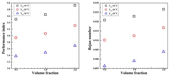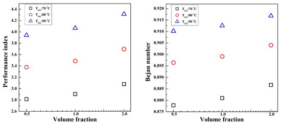 The Bejan number is evaluated to quantify the contribution of the volumetric thermal entropy generation rate in the volumetric total entropy generation rate. The Bejan number (Be) is defined as the ratio of the volumetric thermal entropy generation rate to the volumetric total entropy generation rate, as presented by Equation (12) [48].
