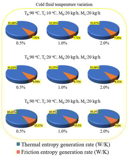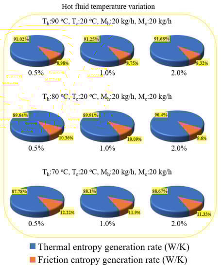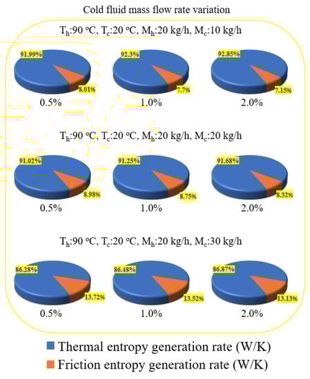 The working fluids in the microplate heat exchanger are exposed to heat exchange which results in entropy generation. The volumetric total entropy generation rate is the sum of the volumetric thermal entropy generation rate and the volumetric friction entropy generation rate as presented by Equation (5) [48].