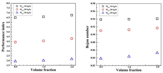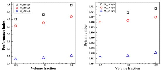 The performance index of the microplate heat exchanger is evaluated using Equation (44) as the ratio of average heat transferred between hot and cold fluids to total pumping power [61].
