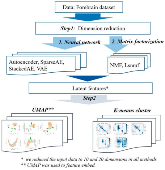 Workflow of the whole process. First, four kinds of neural networks and two kinds of matrix factorization were used to reduce dimension (step 1). Then, UMAP was used to embed the latent features to 2 dimensions and K-means clustered on the extracted low dimensional potential variables (i.e., latent features) to obtain cluster assignments (step 2).