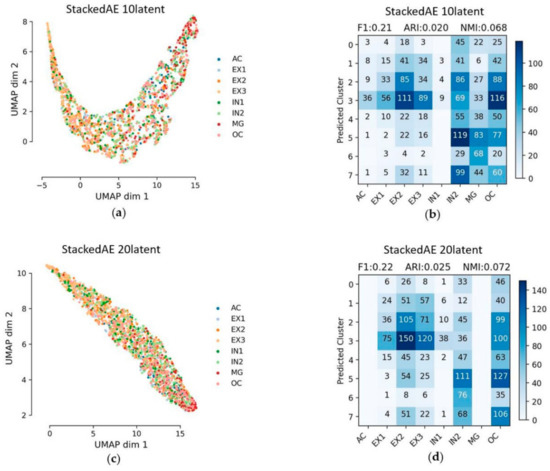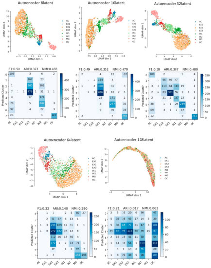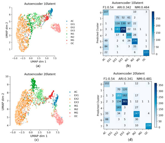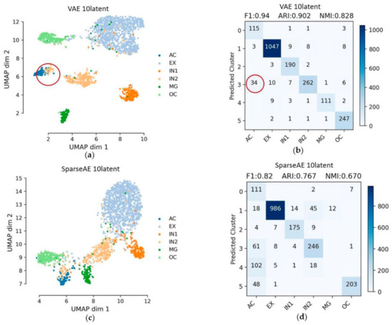 Evaluation of clustering using different methods with different dimensions of latent features are listed in Table 2. VAE displayed the overall best performance and the second is SparseAE. According to the evaluation matrices and the figures in the above subsections, it is clear that EX1, EX2 and EX3 were grouped together (i.e., very close to each other in the UMAP plots) in multiple works. In terms of cell composition, EX1, EX2 and EX3 belong to the excitatory neuron cells, thus it is necessary to make a comparison if all the EX cells (i.e., EX1, EX2, EX3) were assigned to the same label (i.e., EX). Only VAE and SparseAE were used for the additional comparison since the two methods had demonstrated a good performance when using the dataset. The results are provided in Figure 4 and Figure 6. Obviously, the cell types were better separated especially using VAE, when EX1, EX2 andEX3 were regarded as an entire class. The F1 score, ARI, NMI and Silhouette_score of using the VAE reducing dimension to the embedded layer with 10 latent features are: 0.94, 0.902, 0.828 and 0.259, respectively. The F1 score, ARI, NMI and Silhouette_score of using SparseAE reducing dimension to the embedded layer with 10 latent features are: 0.82, 0.767, 0.670 and 0.065, respectively (Table 3). In Figure 9a,b, 34 IN2 were mixed in AC and the assignment of other parts are relatively good when using VAE with the embedded layer with 10 latent features. AC belongs to Astrocyte and IN1 mainly belongs to GABAergic neurons but some gene marks of IN1 are in astrocyte [24], so it is normal for a small amount of IN1 to be wrongly assigned to AC. In the case of using SparseAE with the embedded layer with 10 latent features, MG (i.e., 102) were mixed in AC, 61 IN1 were mixed in AC and 48 OC were mixed in AC. The assignment of other parts is relatively good. Although OC mainly belongs to Oligodendrocyte, many OC-marked genes are in Astrocyte. Therefore, except for the mixed EXs (EX1–3), the only problem is that some MG are wrongly assigned to AC for SparseAE. So, it is possible to make two steps, detecting that using VAEs for separating the six kinds of cells at first and then using other method for separating the EX (EX1–3) cells.