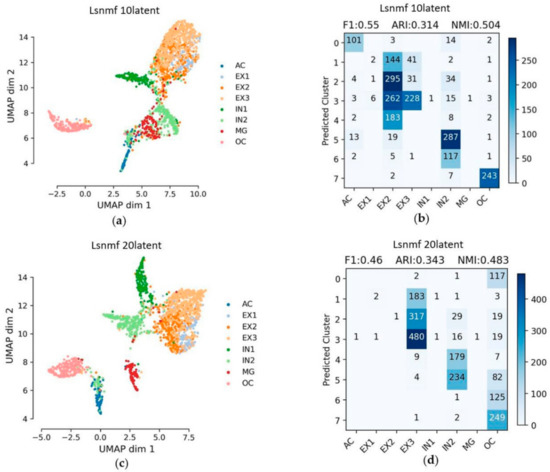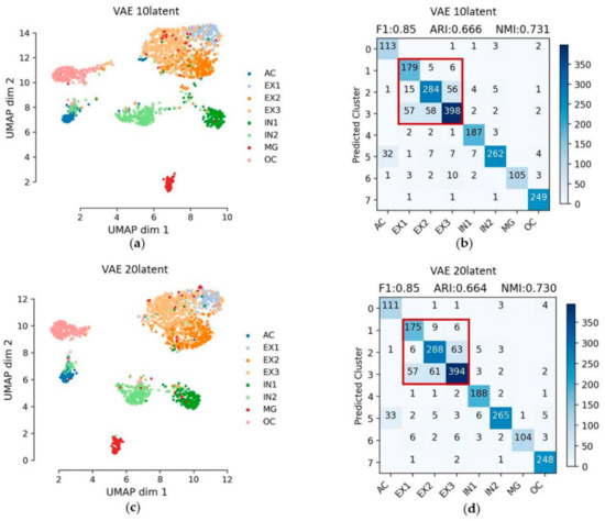 The Feature embedding and evaluation matrices of the embedded layer with 10 latent features and 20 latent features using VAE are shown in Figure 6. From the visualization of latent features, almost all cell types can be separated. Moreover, cluster assignments approach to the reference cell types. EX1, EX2 and EX3, three clusters of excitatory neuron cells, can be basically separated, especially EX1, but AC still mixed a lot of IN2. The result of the embedded layer with 20 latent features is close to that of the embedded layer with 10 latent features; the dimension of dimension reduction has little effect on VAE. The F1 score, ARI, NMI and Silhouette_score of the embedded layer with 10 latent features using VAE are 0.85, 0.666, 0.731 and 0.223. The F1 score, ARI, NMI and Silhouette_score of the embedded layer with 20 latent features are 0.85, 0.664, 0.73 and 0.236 (Table 2). The red boxes in Figure 6b,d represent EX1, EX2 and EX3. For a more in-depth analysis, EX1, EX2 and EX3, which are three clusters of excitatory neuron cells, are classified into one category in Section 3.7 An additional test by merging the label of EX cells.