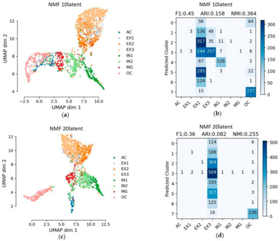 The feature embedding in different latent features using NMF is shown in Figure 7. In the case of NMF dimensionality reduction, the result of 10 latent features is better than that of 20 latent features. The F1 score, ARI, NMI and Silhouette_score of the embedded layer with 10 latent features are 0.45, 0.158, 0.364 and 0.339. The F1 score, ARI, NMI and Silhouette_score of the embedded layer with 20 latent features are 0.36, 0.082, 0.255 and 0.298 (Table 2).