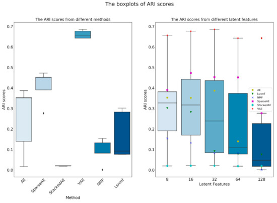 The boxplots of ARI scores generated from different methods and latent features. In the figure the black Diamond (◊) is outlier.