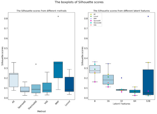 The boxplots of Silhouette scores generated from different methods and latent features. In the figure, few marker were overlapped. For example, the marker ‘Җ’ in blue is the NMF on the upper whisker, and the black Diamond (◊) is outlier.