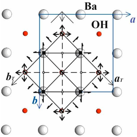 One of the best nonlinear optical crystals, BiO(IO3) [1], has a similar chemical formula to the new iodate, Ba(OH)(IO3). Let us compare both of these crystal structures. Despite different formulas and especially properties, they have many common features. The central layer contains Bi and O instead of Ba and OH. It can be described as composed of anion-centered tetrahedra with four Bi-atoms around the central O atom. IO3-umbrella-like groups are located above and below the central layer L0 forming analogues to Ba-iodate “layers”. BiO(IO3) structure is given in bc-projection (Figure 3b) in accordance with the choice of axes in the X-ray experiment (a,b,c-axes in Ba(IO3)OH correspond to c,a,b-axes in BiO(IO3)). The symmetry of the central layer L0 in Bi-iodate is equal to the symmetry of the layer L0 in Ba-iodate P4/nmm. In Bi-compound the iodate layers L1, L1′ are slightly distorted and do not have a mirror plane (only glide-plane), in contrast to the Ba-compound, but are very similar, having polarity along the layer alternation, τ and inside the layer. However, multiplication of iodate layers L1, L1′ above and below the central L0 layer in both iodates are principally different. All the dipole moments of umbrella-like groups in Bi-iodate are oriented almost identically forming a polar 21 axis of the structure (Pca21). That means, multiplication of the L1 layer to L1′ in the triple is made by another 21 axis of the tetragonal group which is perpendicular to the first, being parallel to the c-axis [1], equal to the a-axis in Ba-iodate. The groupoid of symmetry is principally the same but is added by new σ-PO.