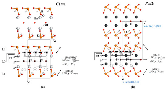(a) Ba(IO3)OH structure in ac projection. Layers L0, L1, L1′ are shown with local symmetry elements. Note that tetragonal space group of L0 layer is in side projection, arrows visualize layers L1, L1′ multiplication; (b) BiO(IO3) structure in bc projection, arrows visualize layers L1, L1′ multiplication.
