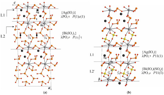 (a) AgBi(IO3)4 structure in side projection; (b) AgBi(IO3)2(SO4) structure in side projection. Ag and Bi atoms are shown with black and gray spheres. The boundary between L1, L2 layers are shown with the horizontal solid lines. Local symmetry elements are shown.