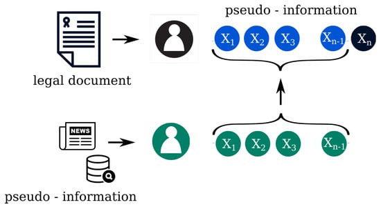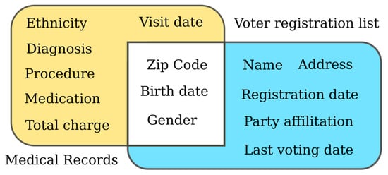 The apparent goal of the data anonymization or de-identification process is to remove all of the involved individuals’ direct identifiers, such as names, addresses, phone numbers, etc. [16]. This step might seem obvious; however, it is easy to defeat this kind of anonymization by linking attacks or more sophisticated attacking models [30]. These algorithms collect the text’s auxiliary information and link it with public, not anonymous records [31,32,33], as shown in Figure 2.