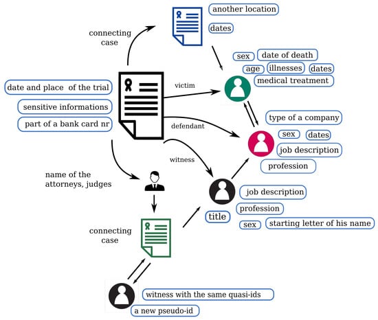 The previously introduced Swiss case study about re-identifying pseudonymized legal cases used a marketer strategy with a simple linking attack. The researchers wanted to re-identify as many people as they can, surprisingly, they could re-identify 84% of them within an hour) [19]. The reason for this is the presence of a large number of quasi-identifiers in legal documents. The wide range of quasi-identifiers, both in number and type, generally provide enough information for a human to de-anonymize the documents. As Mozes and Kleinberg pointed out, even a single identifying attribute can be sufficient for re-identification [27]. Since legal cases always tell the story of the two or more sides involved, the texts contain many events, people, and institutions (two sides, judges, attorneys, witnesses, etc.). A legal document contains one case, which is interpreted in at least three different ways. It is possible that each of these single interpretations cannot contain enough microdata to re-identify the persons, but the series of these interpretations serve enough information for de-anonymization (Figure 4), as it is shown in Section 5.4.