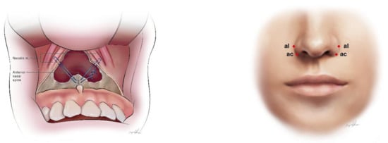 - Howley, C.; Ali, N.; Lee, R.; Cox, S. Use of the alar base cinch suture in Le Fort I osteotomy: Is it effective? Br. J. Oral Maxillofac. Surg. 2011, 49, 127–130. [Google Scholar] [CrossRef]