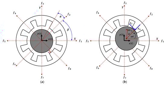 where is the magnetic permeability, is the cross-sectional area of each electromagnetic pole, is the windings number of the electric coil of each pole, is the electric current applied on each pole, is the actual air gap between the rotating disc and each pole, and is the half-angle of the radial electromagnetic circuit as shown in Figure 1a. It is worth mentioning that the eight poles are considered to be symmetric. Depending on Figure 1a, for small deviations and of the rotating disc, the actual air gap among the pole and the rotating disc can be written as follows:
