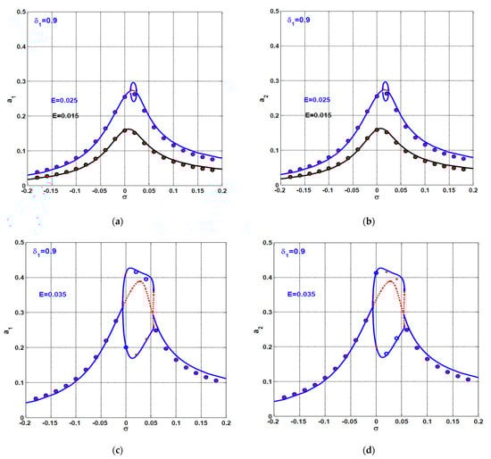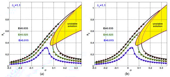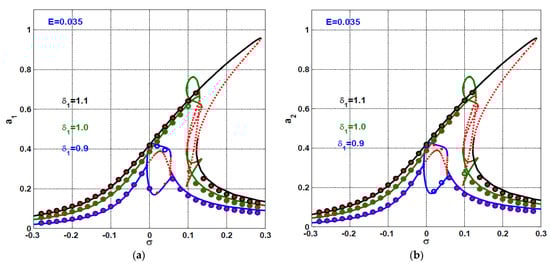 By solving Equations (44)–(47) in terms of the system and control parameters (i.e., ), we can obtain the different response curves as illustrated in Section 4. Furthermore, the stability of the solution of Equations (44)–(47) can be explored via investigating the Jacobian matrix eigenvalues of the right-hand side of Equations (38)–(41). Let the steady-state solution of Equations (44)–(47) be ( ), while ( ) is a small perturbation about that steady-state solution. Accordingly, we can assume
