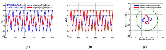 Figure 3 shows numerical simulations for the system equations of motion (i.e., Equations (23) and (24)) corresponding to Figure 2c,d when . The figure shows the system temporal oscillations and (i.e., Figure 3a,b) and the corresponding whirling orbits (i.e., Figure 3c) when and at the two initial conditions and . The system’s sensitivity to the initial conditions is shown in Figure 3, where the system performs one of two spinning motions depending on the initial conditions. By examining Figure 3, we can conclude that the rotor system can oscillate by the oscillation amplitudes or depending on the initial conditions, which agree with Figure 2c,d at . Accordingly, it is worth mentioning that the obtained nonlinear algebraic system (i.e., Equations (44)–(47)) describes with excellent accuracy the steady-state oscillation amplitude of the studied system (i.e., Equations (23) and (24)) when .