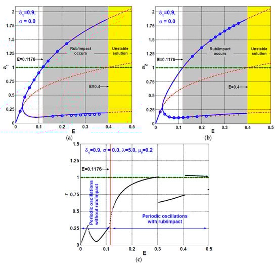 According to the periodic solutions given by Equations (42) and (43), it is easy to show that the rotor system can oscillate without rub-impact force occurrence if and . This implies that as long and , there is no rub-impact force between the rotor and the stator, otherwise (i.e., if and/or ) the rub-impact force between the rotor and stator occurs. Accordingly, the steady-state oscillations of the considered system can be investigated via solving the nonlinear algebraic system given by Equations (44)–(47) numerically in terms of the system parameters and as long as and . In addition, the solution stability of Equations (44)–(47) can be explored via examining the eigenvalues of the linearized system given by Equation (49). However, if and/or , this means there is the occurrence of the rub and/or impact forces, which necessitates the investigation of the whole discontinuous system given by Equations (23) and (24) numerically when . The different response curves and bifurcation diagrams are obtained via adopting the actual and the corresponding dimensionless parameters given in Table 1 (See Refs. [,]). By solving Equations (44)–(47) using MATLAB software, one can obtain the different response curves as in Figure 2 where the stable solution is shown by the solid line, while the unstable solution is represented by the dotted line. To confirm the accuracy of the obtained response curves, Equations (23) and (24) (when ) has been integrated numerically using the ODE45 MATLAB function. The obtained numerical results are illustrated as small circles (when sweeping the bifurcation parameters forward) and as big dots (when sweeping the bifurcation parameters backward).