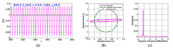 (a) The steady-state radial oscillation , (b) the whirling orbit, and (c) frequency spectrum of the rotor AMBS according to Figure 15 when and .